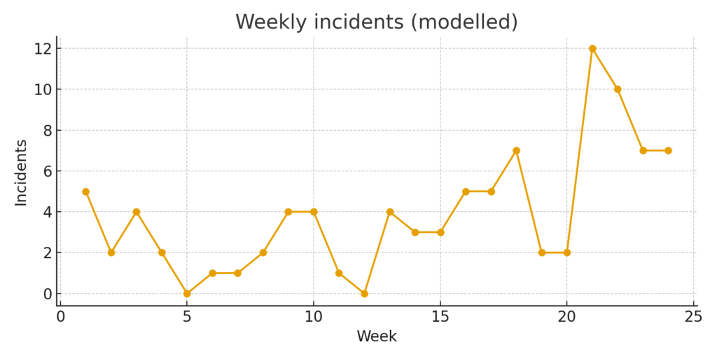 ※下図は公開報道をもとに筆者が推定・モデル化した週次合成データのASCII管理図です。実数は公式統計ではありませんが、傾向把握に有益です(データCSVを生成済)。