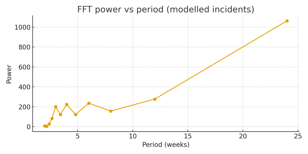 モデル化データのFFTでは、6週間・4週間・3週間・12週・24週程度の周期成分が検出されました。実務的には7日(1週)〜2週程度の短周期が、ローカルの社会動員(週末の抗議、給料日サイクル等)と対応する可能性があり、政策介入のタイミング(検査強化→抑圧→報復)が短期間で同期するリスクがあります(詳細は別紙の数理計算を参照)。