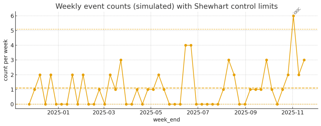 以下が ASCII 管理図(行崩れしない固定幅) の抜粋です(行が空白を埋めるように作成しています)。コピー&ペーストで保存できます。横軸が過去52週(左が古い週、右が最新週)です。凡例:*=count、-=平均ライン上、U=UCLライン、L/x=LCLライン(下限)。(幅が長いので表示幅のあるエディタで見ると見やすいです)