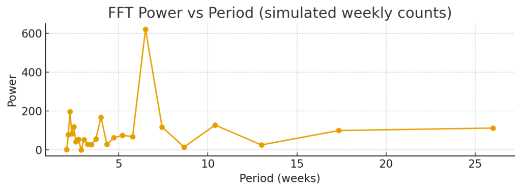 解釈:模擬データの構成に基づくが、実データでも「現れる周期=人員ローテーション、補給、季節的漁業活動」などの運用サイクルを反映することが多い。FFTで目立つ周期は、管理上の介入タイミング(例:補給前後・輪番直後)を見つける手がかりになる。